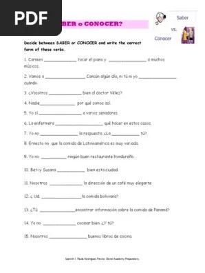 Decide between saber or conocer and write the correct. You can do the exercises online or download the worksheet as pdf. Complete each dialogue with the correct form of saber or conocer. Saber & conocer conjugations · practice worksheet: Carmen ______ tocar el piano y.